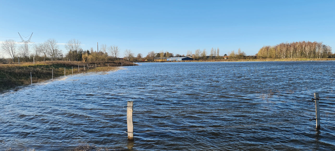 Figur 1: Coastal squeeze. En veludviklet strandeng med høj diversitet i 2020 foran dyrkede marker, oversvømmes ved havvandsstigninger (COWI-Arkitema, 2021).